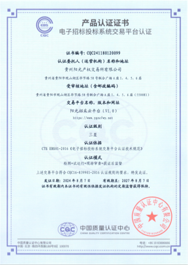 貴州陽光產(chǎn)權(quán)交易所“陽光招采云” 電子招投標平臺順利通過中國質(zhì)量認證中心審核,獲得EBS電子招標投標系統(tǒng)交易平臺三星認證證書。