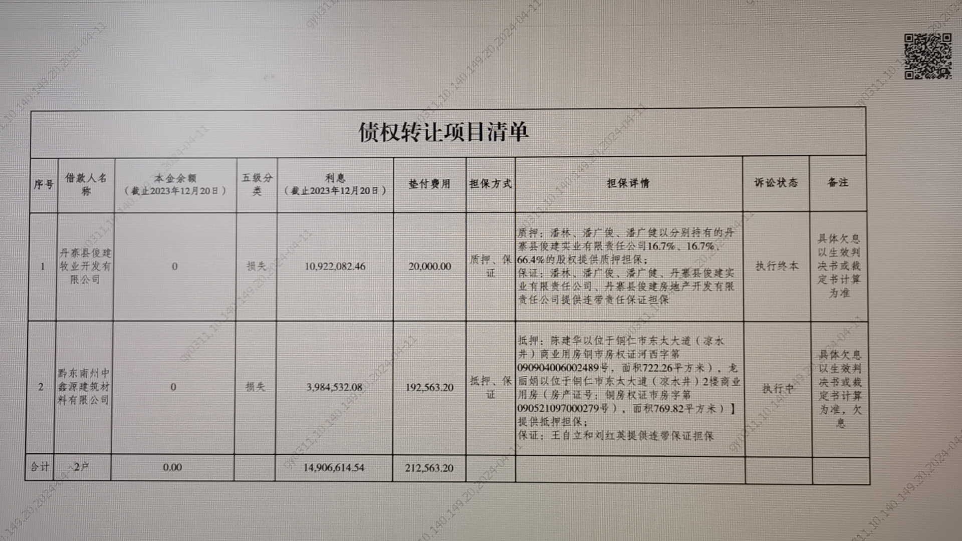 丹寨縣俊建牧業(yè)開發(fā)有限公司、黔東南中鑫源建筑材料有限公司2戶不良貸款債權及相關附屬權益整體轉讓
