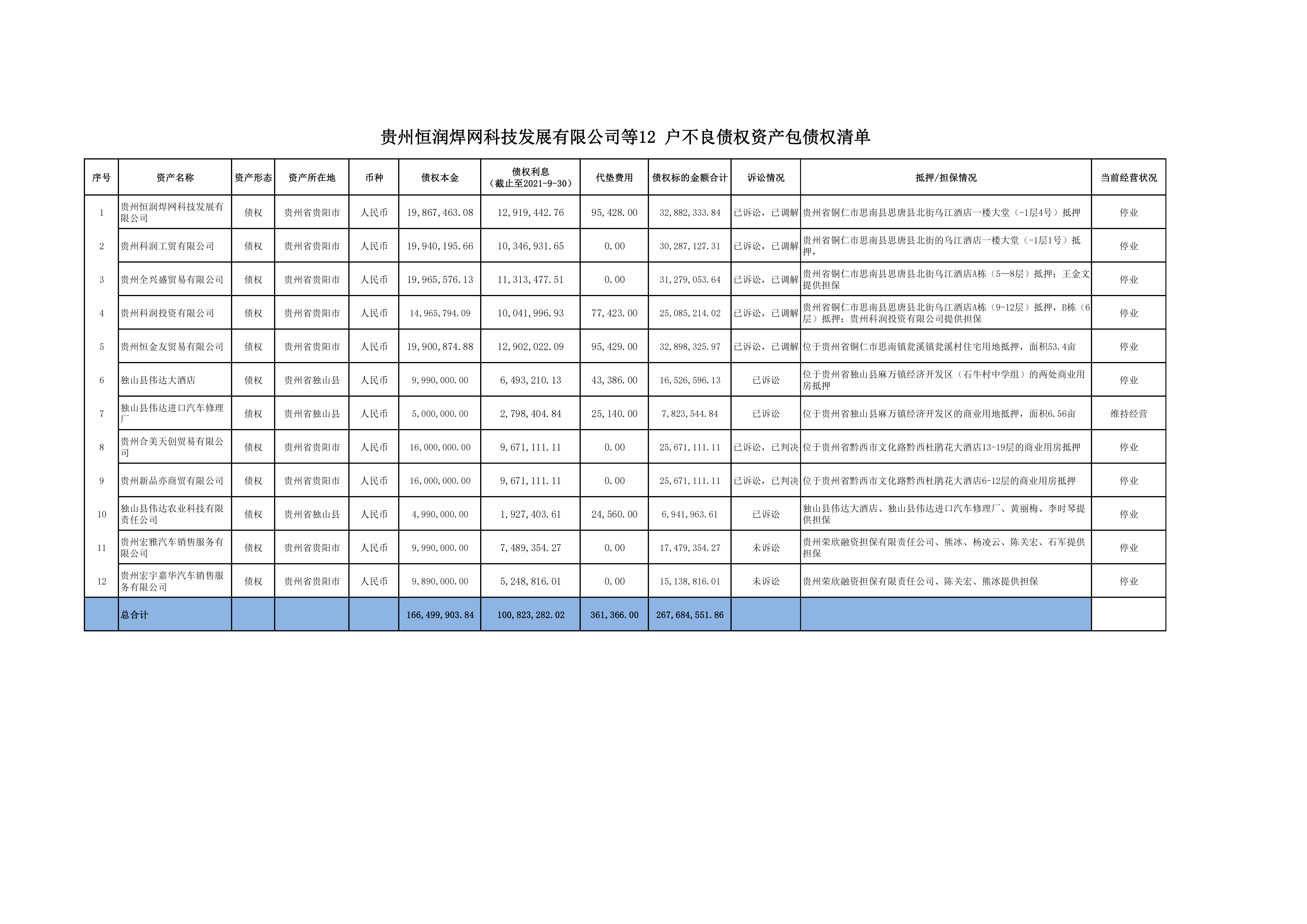 | 債權(quán)信息 | 債務(wù)人名稱 | 貴州恒潤焊網(wǎng)科技發(fā)展有限公司等12戶債務(wù)人,詳見“附件清單” | ||||||